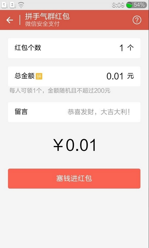 六、当然,如果是用这种普通红包的方式,发出去了其实不太容易收回来..所以,如果是你觉得不太可靠的发送对象的话,可以把要发送的红包改成"拼手气红包"方法是从钱包的入口打开微信红包,然后点那个"拼手气群红包"进入后,,设置好要发送的总金额,,再把"红包个数"设置成1 ,然后点塞钱进红包.
