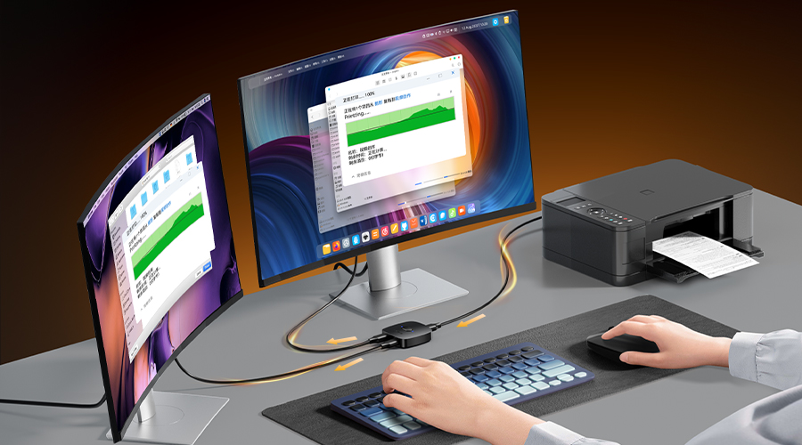 职场办公:双电脑共用打印机、键鼠,桌面整洁无杂乱,切换高效不耽误工作;